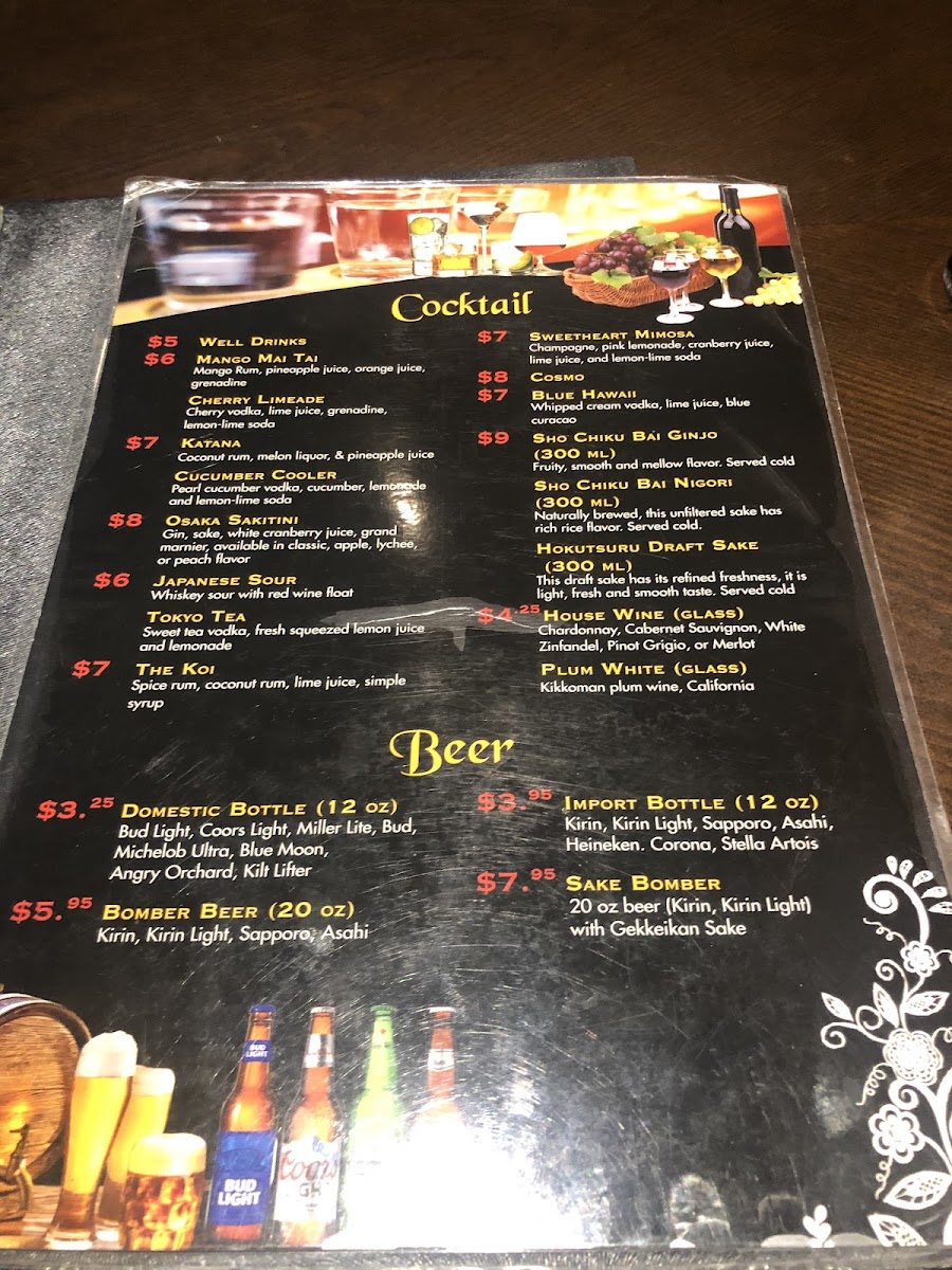 Food was outstanding. From the salad, miso soup to the entrees. Salmon, filet mignon and shrimp. Great price under 50 for the 2 of us.