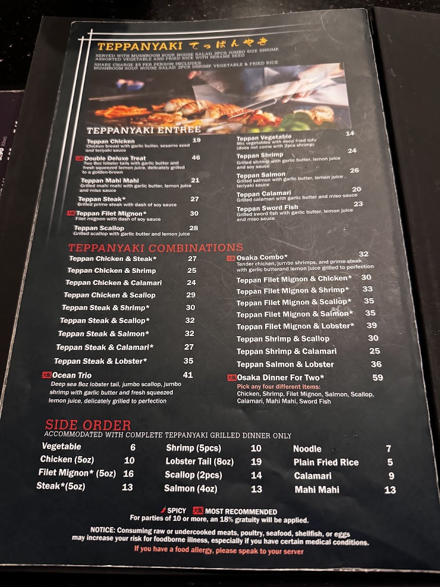 A Sizzling Experience at Osaka Teppanyaki! Our visit to Osaka Teppanyaki was nothing short of spectacular! From the moment we made our reservation for a large party, everything was seamless and stress-free. The staff went above and beyond to accommodate us, proving just how easy it is to plan a group dining experience here. The service was absolutely flawless—attentive, friendly, and downright fun! The chefs were true performers, flipping shrimp into mouths and setting onions aflame with flair that had everyone at the table laughing and cheering. The food? Fresh, flavorful, and cooked to perfection right before our eyes. Every bite was a treat, and the portions were generous enough to ensure no one left hungry. Overall, Osaka Teppanyaki is a must-visit if you’re looking for a dining experience that’s as entertaining as it is delicious. Perfect for celebrations, group outings, or even just a fun night out. We’ll definitely be back!